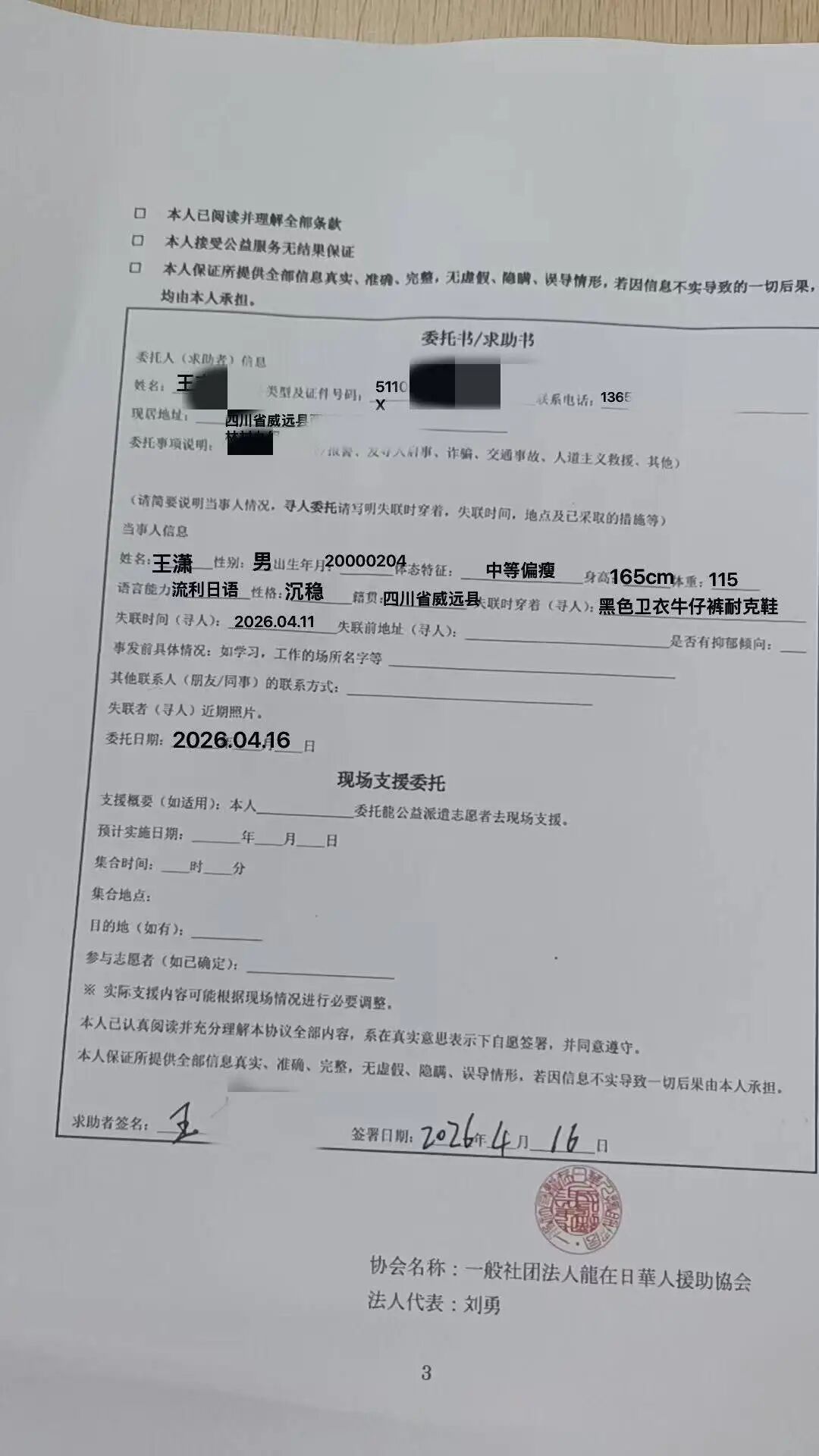 王潇父亲委托日本华人组织帮助寻人