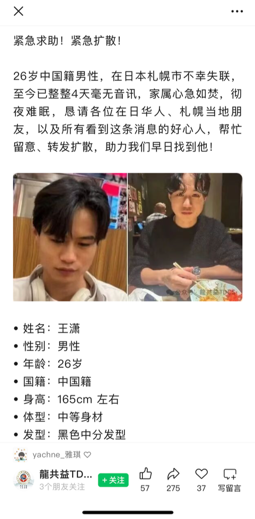 “我得知弟弟失联的第二天就去办护照,但外事民警提醒说,我一个人前往,比较担心我的安全,如果日本那边有什么消息再紧急帮我办理,送我过去。”王琪说。虽然人在国内,他们仍在想尽办法寻找王潇,包括向中国驻札幌总领事馆提交协助寻亲申请书,希望领事馆督促日本警方搜寻,并且联系到了当地华人组织协助寻人。