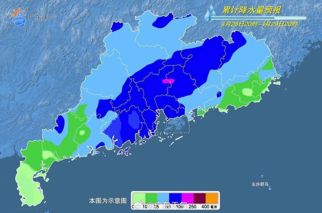 4月28日20时至29日20时,广东省累计降水量预报示意图。图片来源:广东天气官方微博