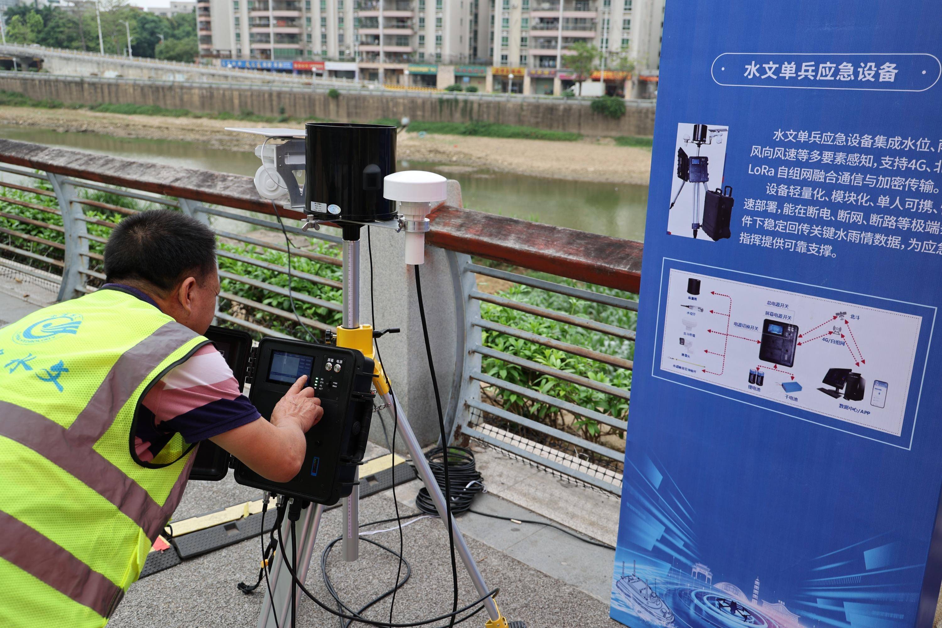 近日,广东省水文局开展应急监测演练,工作人员通过水文单兵应急设备进行雨量、水位监测。广东省水文局供图